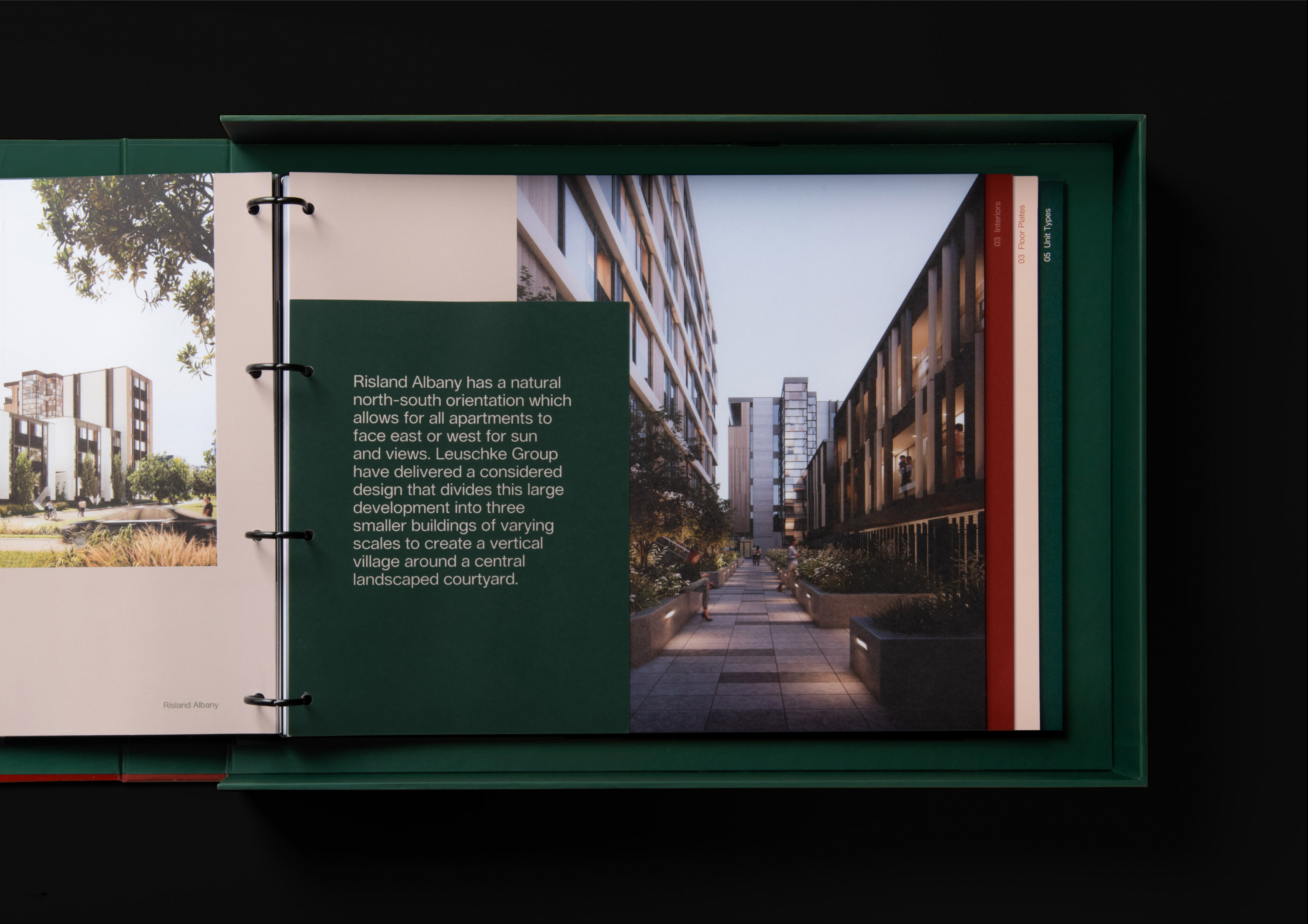 Risland Albany is a large scale apartment development in Auckland’s North Shore, situated in close proximity to Westfield Albany. We were engaged by the client to design the branding, sales tools and display suite for this project.