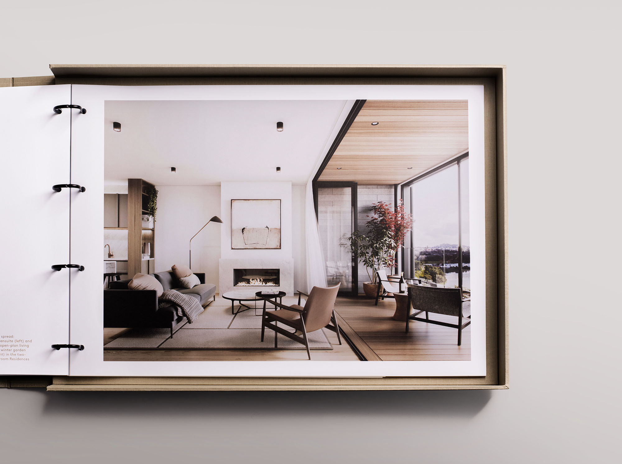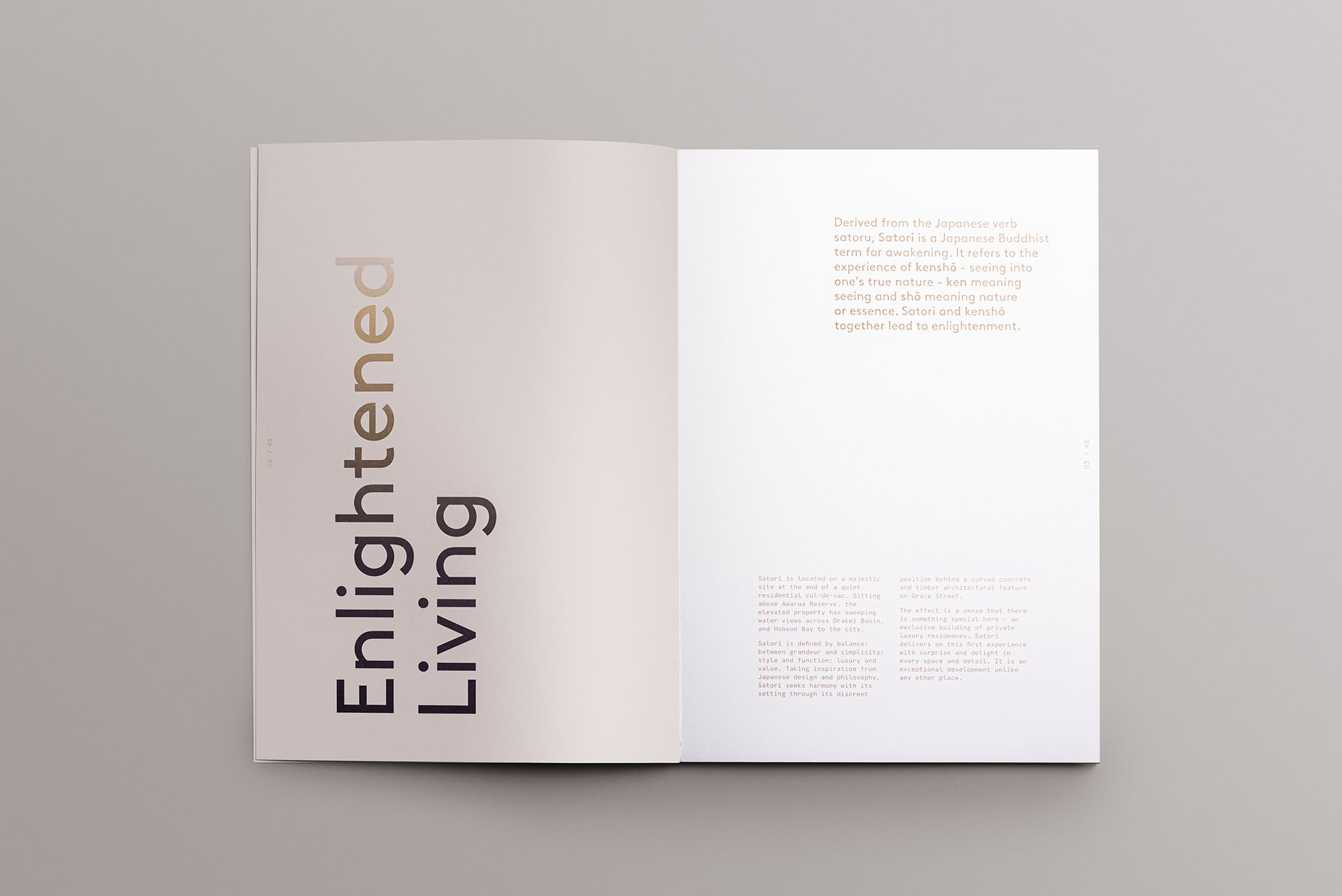 Our strategy was to capture this audience by appealing to highbrow sensibilities. In collaboration with the architect and the client, inspiration was drawn from Japanese aesthetic principles to inform architectural elements and the brand design. Characterised by contemplative design qualities, the Japanese aesthetic is referenced in the messaging ‘enlightened living’ - calling to mind a sense of understated luxury, underpinned by a considered design approach.