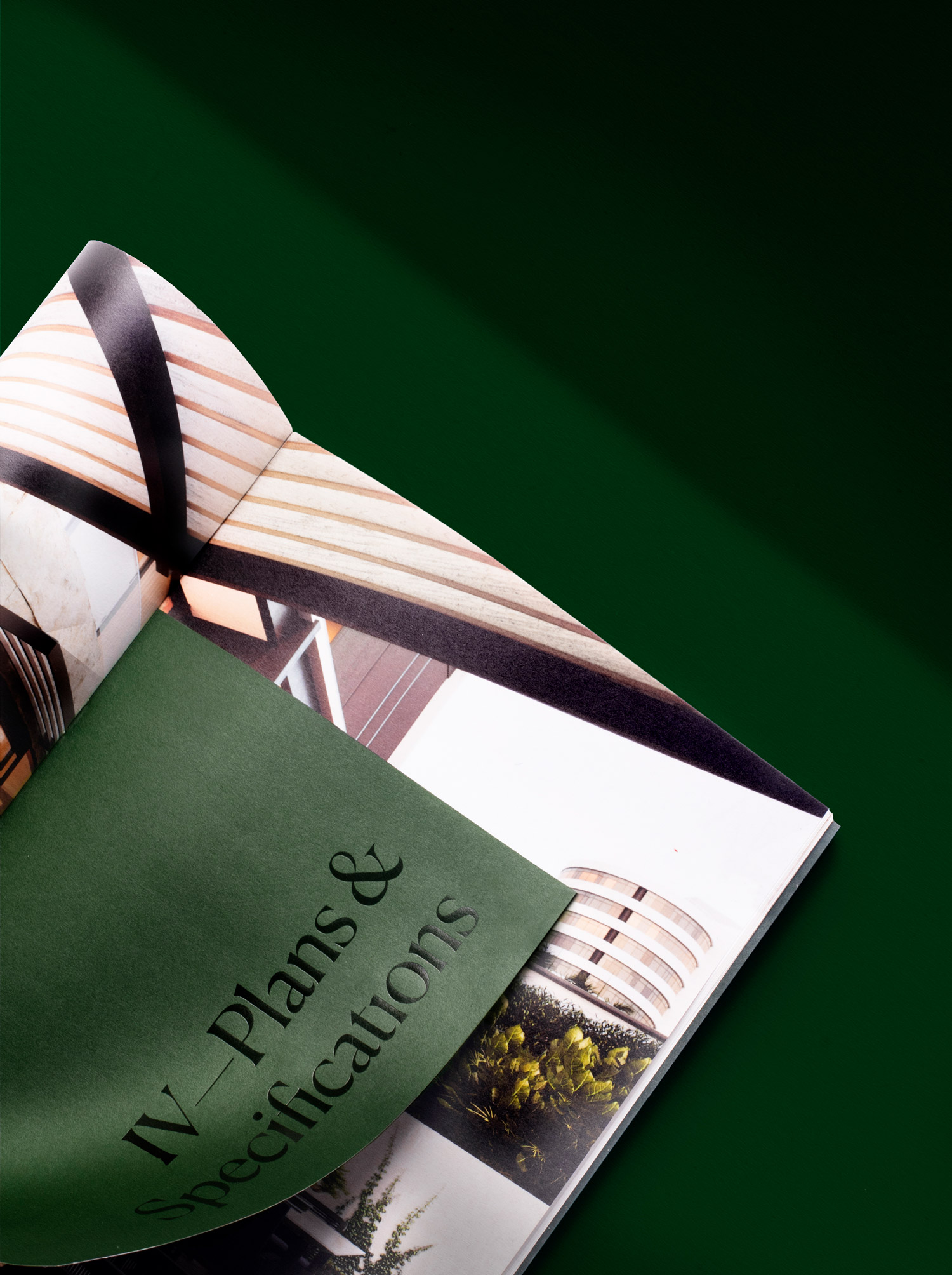 The building’s materiality, form and design played a role in informing aspects of the graphic language – a deep green brand colour was chosen to convey opulence and distinction, while sandstone conveyed light and space. An elegant serif typeface was employed, complemented by an expressive, contemporary sans serif resulting in a distinctive voice for XXXII.